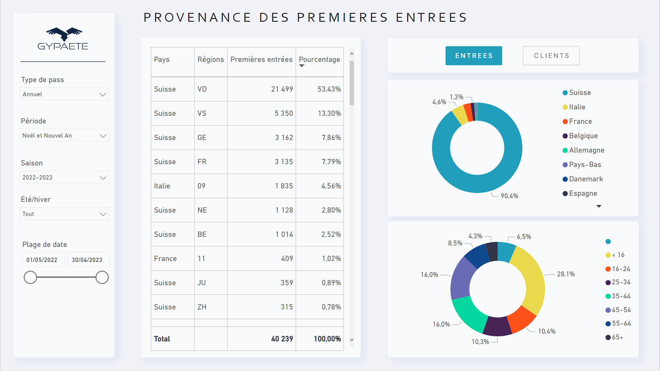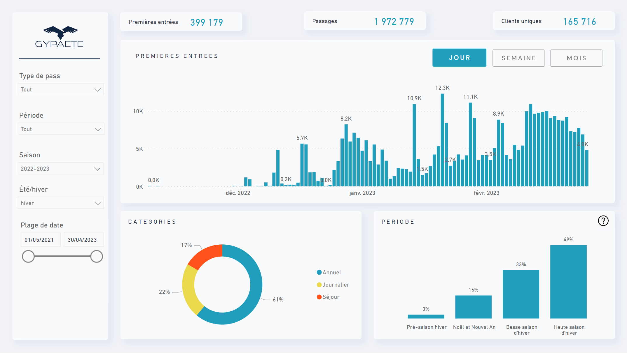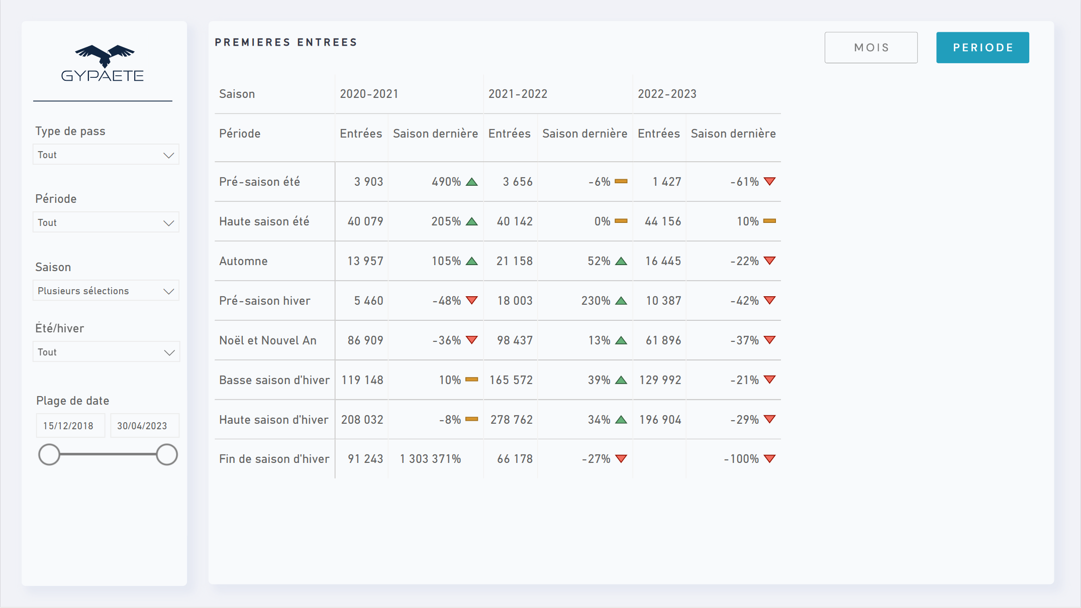 Dieses Modul ermöglicht es, die Besucherzahlen im Skigebiet zu verfolgen und die Herkunft der bekannten Kunden zu berücksichtigen. Diese Informationen werden gekreuzt und anhand zahlreicher Indikatoren gemessen. Dies ermöglicht es, sie nach den gewünschten Analyseachsen zu bewerten und zu vergleichen.